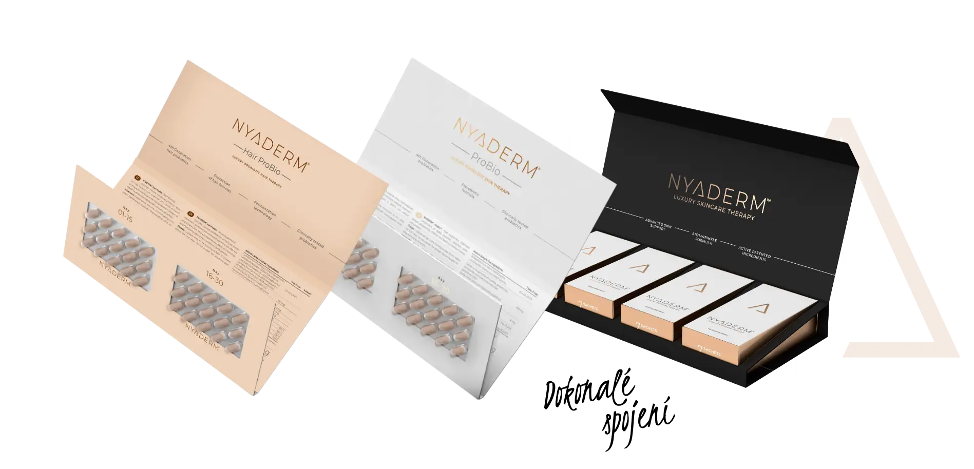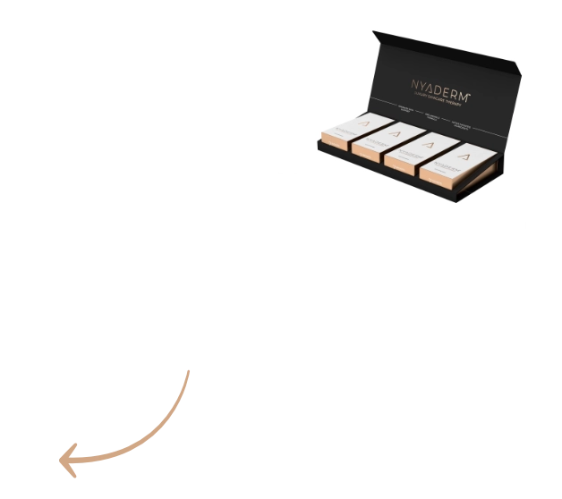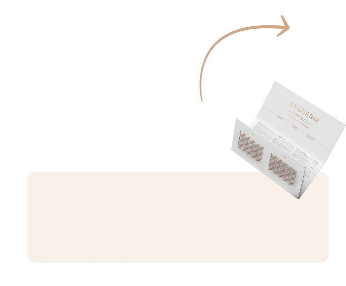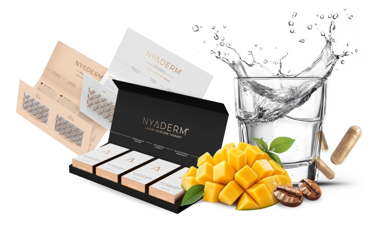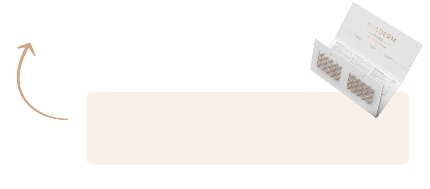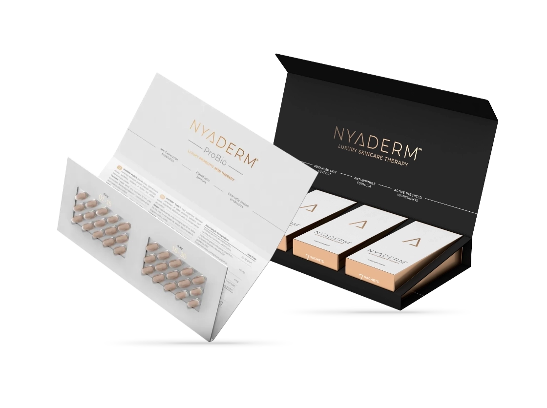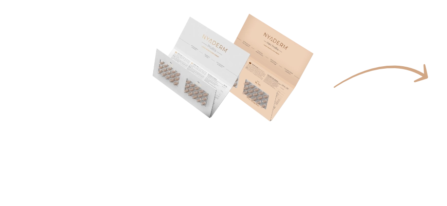 Díky NYADERM® Symbio efektu poznáte viditelnou změnu na vaší pokožce, vlasech a nehtech už za pár týdnů. Zatímco NYADERM® ProBio podporuje zdravou pokožku zevnitř tím, že posiluje trávicí systém a imunitu, NYADERM® Anti-Aging Drink dodává tělu potřebné živiny, vitamíny a antioxidanty.