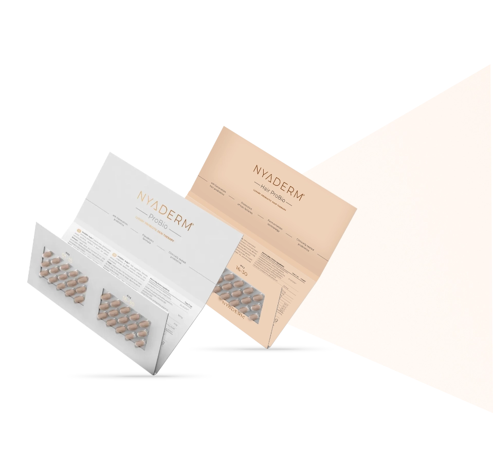 NYADERM® Hair ProBio a ProBio představují špičku v péči o vaši pokožku a vlasy. NYADERM® ProBio podporuje rovnováhu mikrobiomu pokožky, což je zásadní pro krásné a zdravé vlasy. Růst vlasů totiž začíná ve střevech. Díky NYADERM® Hair ProBio dostane vaše tělo pečlivě vybrané látky, které účinně zlepšují růst a kvalitu vlasů.