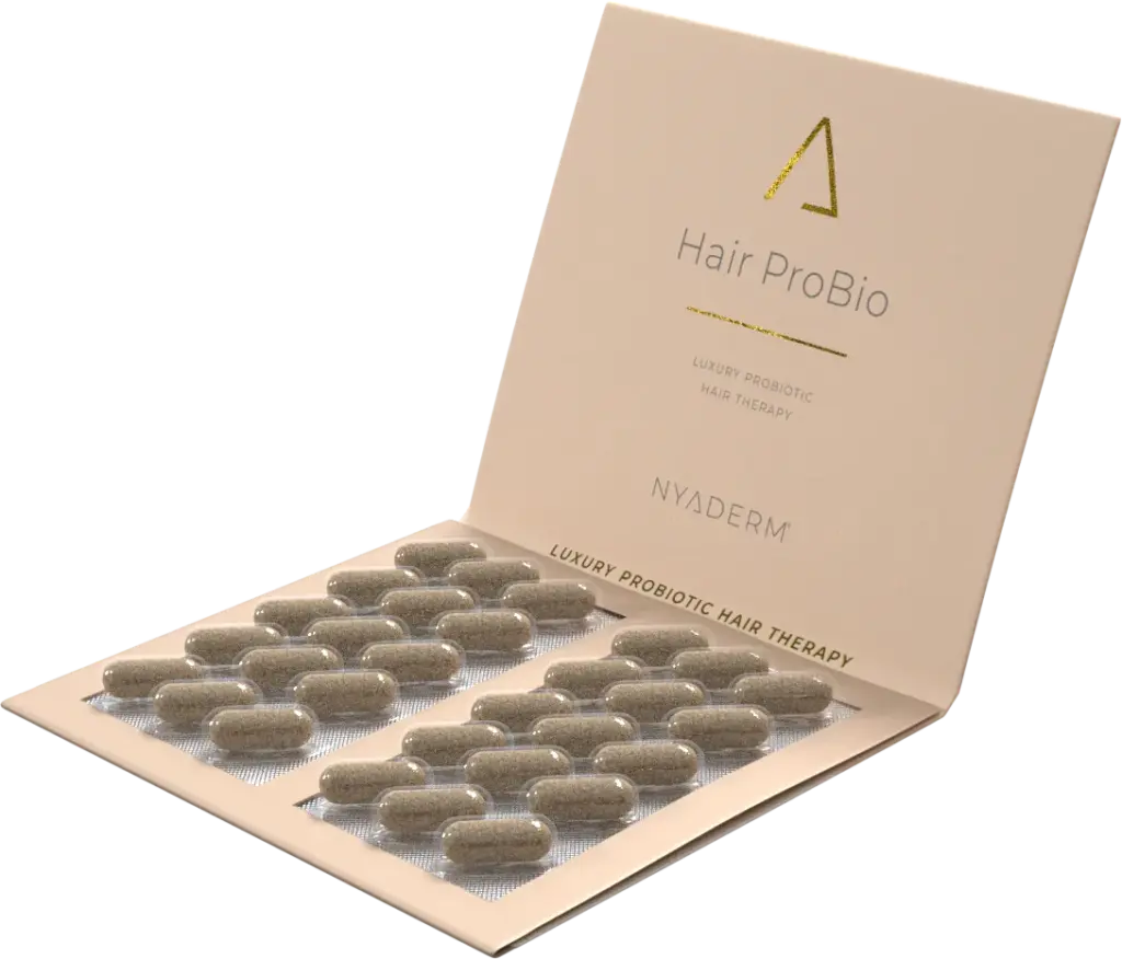 NYADERM® Hair ProBio je doplněk stravy obsahující probiotika 4. generace s přesahem na vlasy. Navíc zahrnuje v sobě přírodní extrakty, aminokyseliny, vitamíny a minerály s komplexním účinkem na zlepšení a udržení optimálního stavu vlasů pro obě pohlaví.