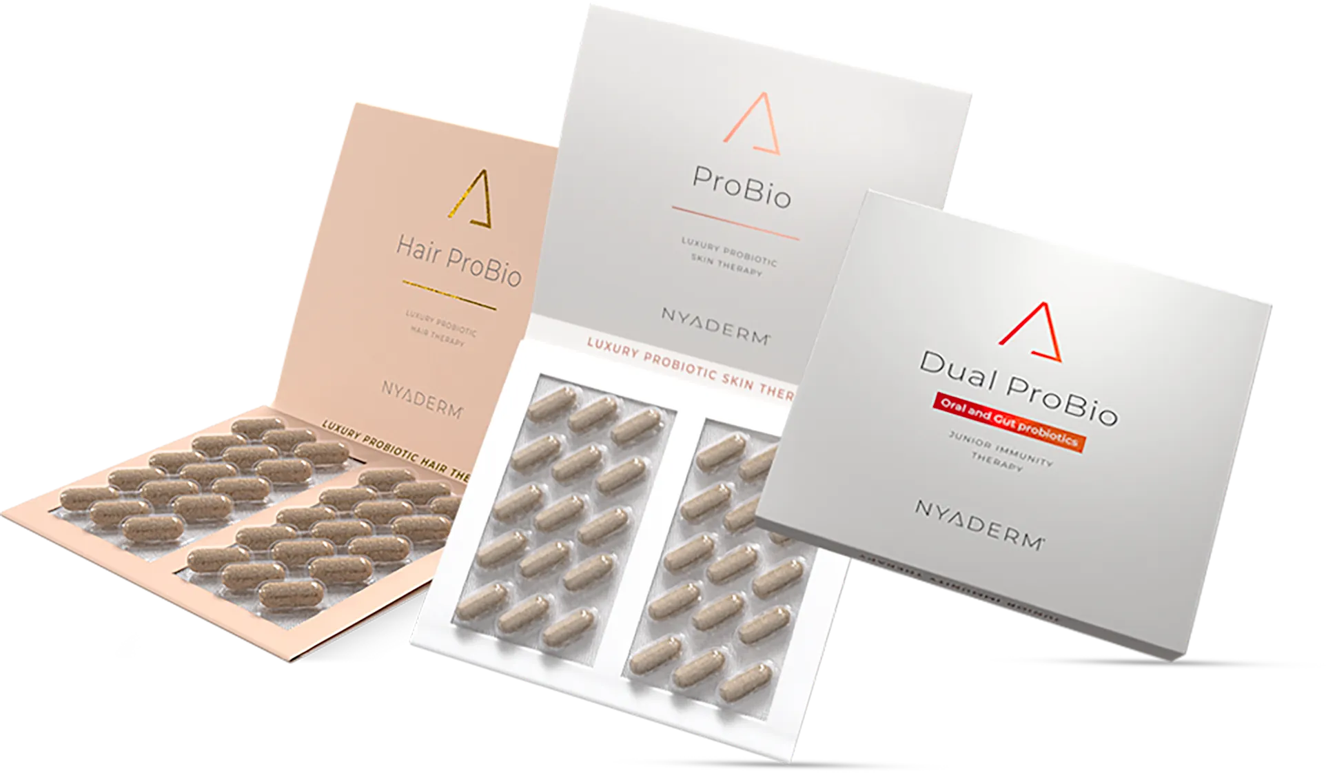 NYADERM® ProBio jsou unikátní probiotika 4. generace, za jejichž vývojem stojí vědec a molekulární biolog RNDr. Petr Ryšávka. ProBio je kombinací klinicky testovaných probiotických bakterií ve formě biofilmu, který je velmi důležitý pro přilnutí bakterií na střevní epitel. Pravidelné užívání ProBio pozitivně působí na osu střevo-kůže a může tak příznivě podílet na zlepšení kvality pokožky.